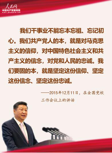 我们干事业不能忘本忘祖、忘记初心。我们共产党人的本,就是对马克思主义的信仰,对中国特色社会主义和共产主义的信念,对党和人民的忠诚。我们要固的本,就是坚定这份信仰、坚定这份信念、坚定这份忠诚。世界社会主义实践的曲折历程告诉我们,马克思主义政党一旦放弃马克思主义信仰、社会主义和共产主义信念,就会土崩瓦解。共产党人如果没有信仰、没有理想,或信仰、理想不坚定,精神上就会“缺钙”,就会得“软骨病”,就必然导致政治上变质、经济上贪婪、道德上堕落、生活上腐化。