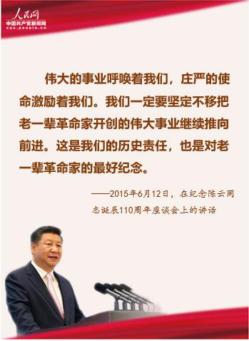 伟大的事业呼唤着我们,庄严的使命激励着我们。我们一定要坚定不移把老一辈革命家开创的伟大事业继续推向前进。这是我们的历史责任,也是对老一辈革命家的最好纪念。