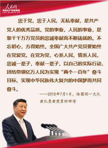 忠于党、忠于人民、无私奉献,是共产党人的优秀品质。党的事业,人民的事业,是靠千千万万党员的忠诚奉献而不断铸就的。不忘初心,方得始终。全国广大共产党员要始终在党爱党、在党为党,心系人民、情系人民,忠诚一辈子,奉献一辈子,以自己的实际行动,团结带领亿万人民为实现“两个一百年”奋斗目标、实现中华民族伟大复兴的中国梦而共同奋斗。