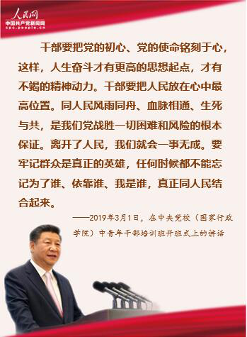 新中国成立70周年,是进行“不忘初心、牢记使命”主题教育的最好时间节点。干部要把党的初心、党的使命铭刻于心,这样,人生奋斗才有更高的思想起点,才有不竭的精神动力。干部要把人民放在心中最高位置。同人民风雨同舟、血脉相通、生死与共,是我们党战胜一切困难和风险的根本保证。离开了人民,我们就会一事无成。要牢记群众是真正的英雄,任何时候都不能忘记为了谁、依靠谁、我是谁,真正同人民结合起来。
