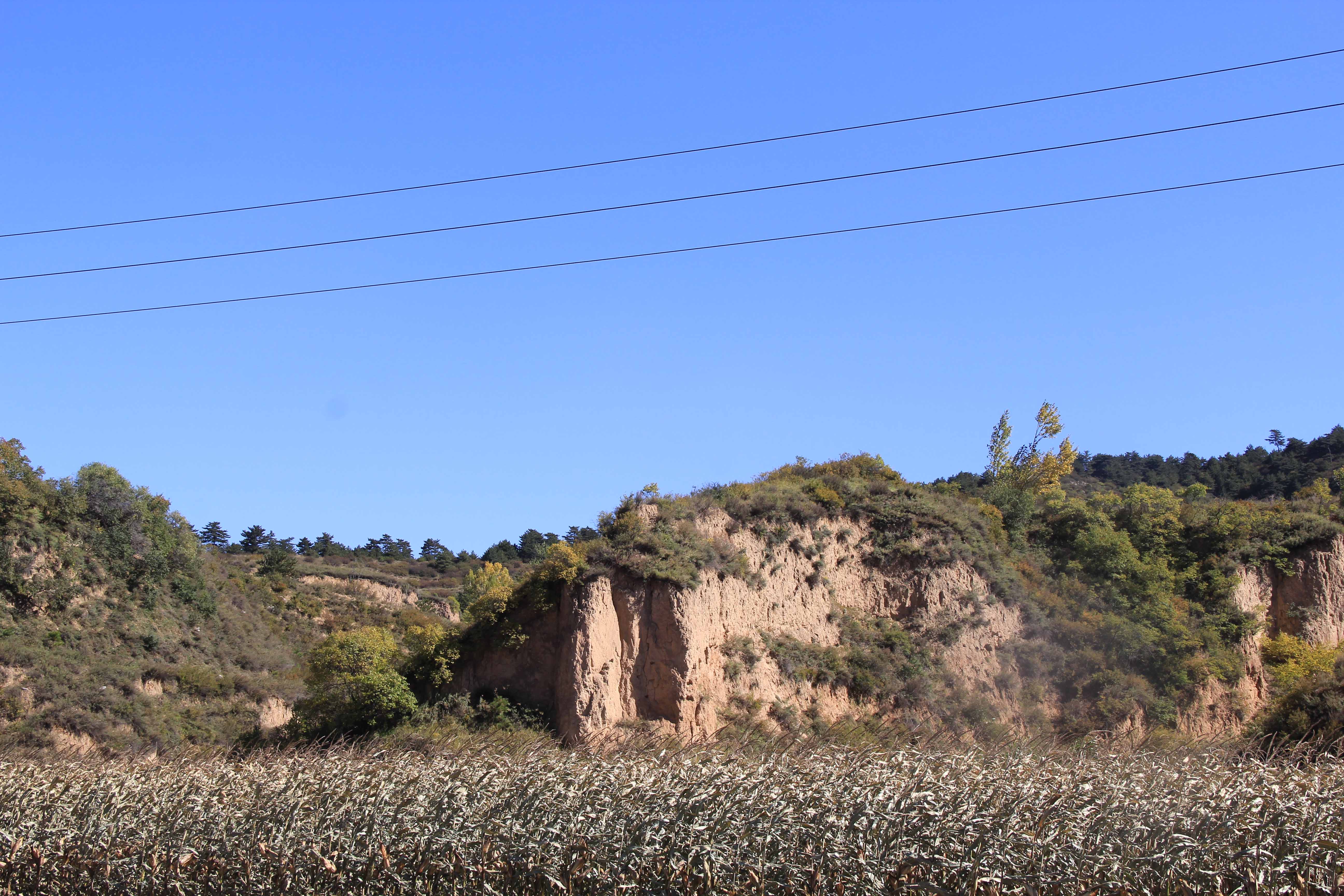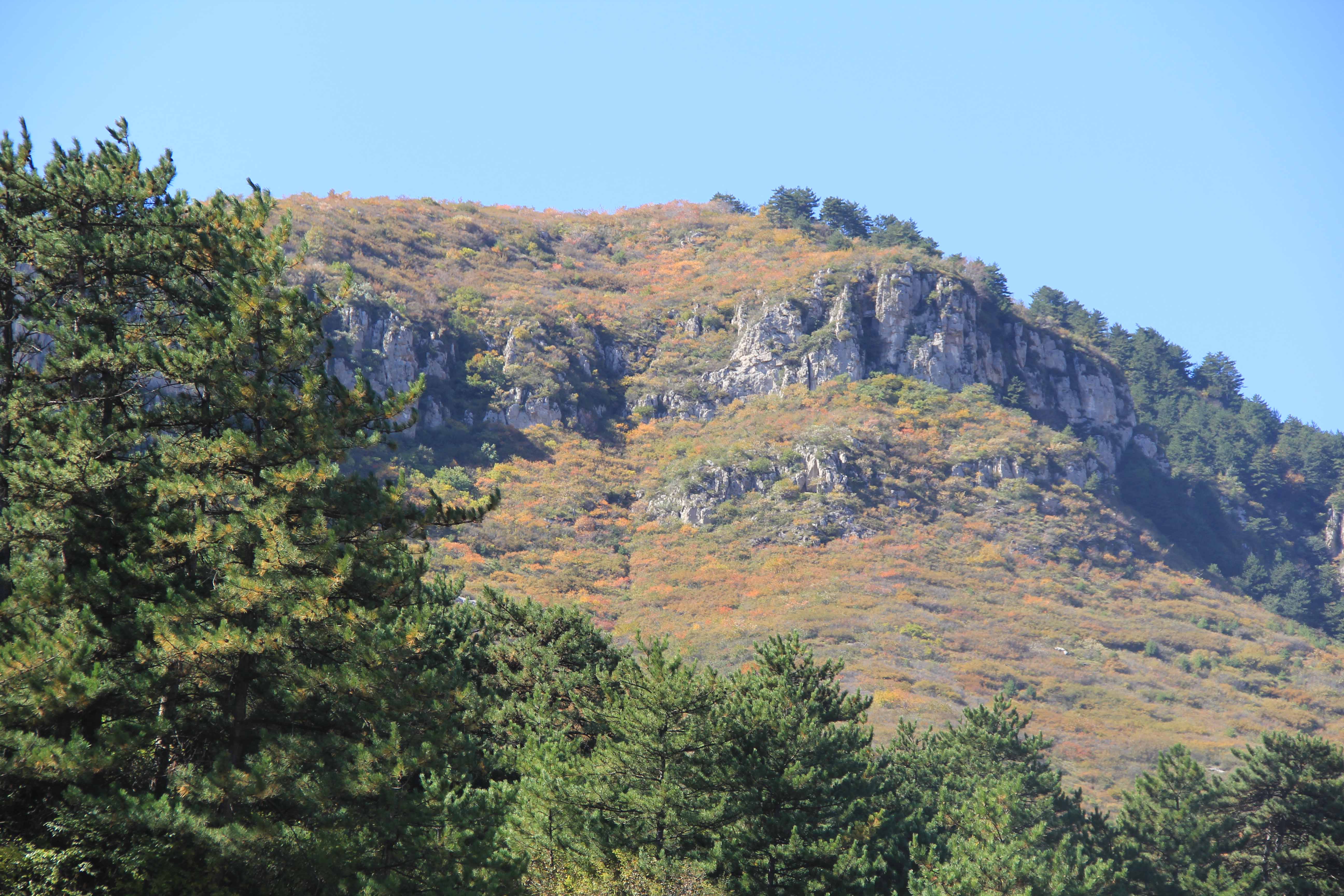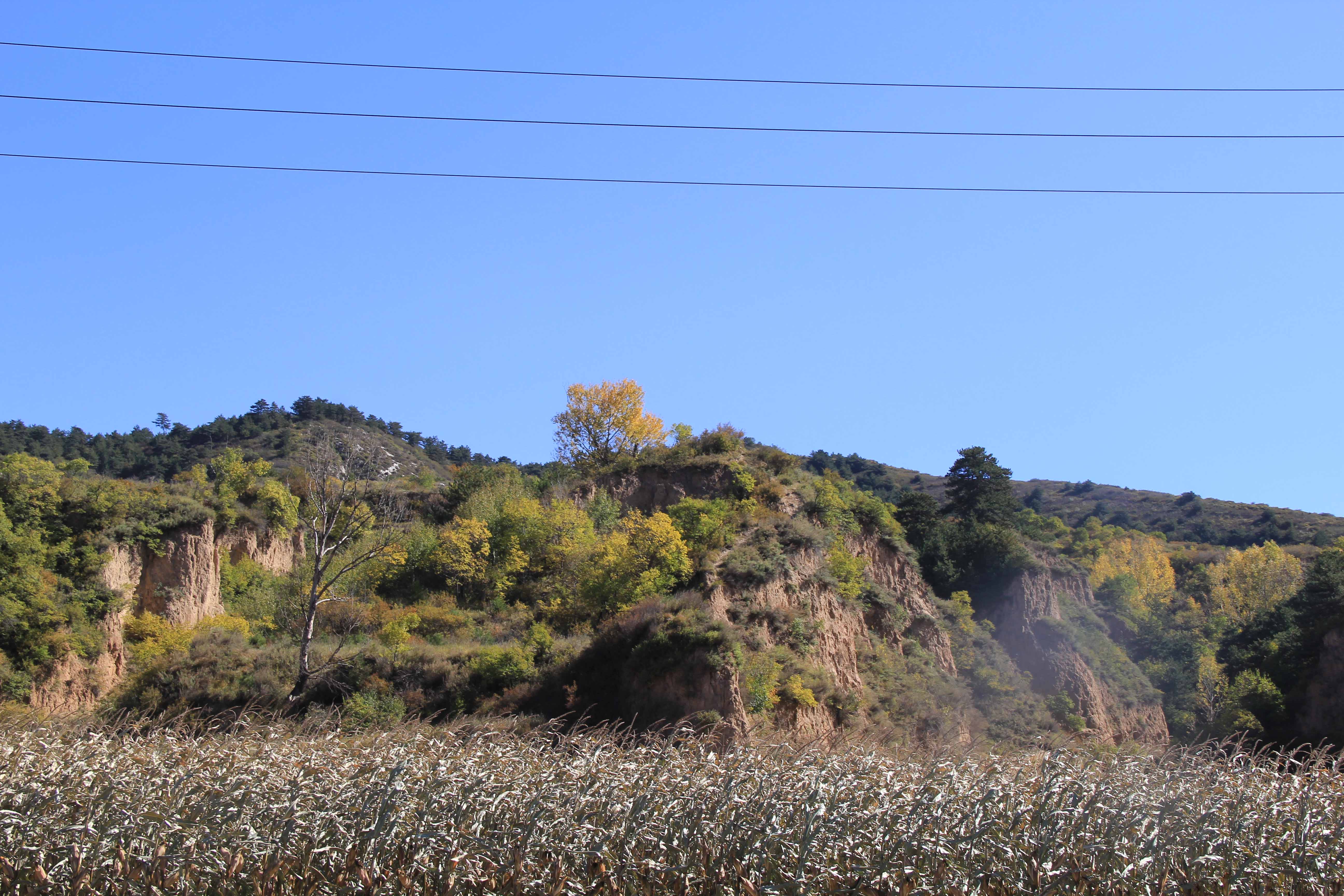 小方山又名大威山,山体垂直高差约200米,顶部为马家沟组灰岩,中部为三山子组白云岩,底部为张夏组鲕状灰岩。马家沟组灰岩与三山子组白云岩岩性分界面形成基岩平台,平台上部马家沟组灰岩边部垂直陡立,岩层发育垂直节理,贯通性良好,在长期的流水侵蚀及重力作用下发生垮塌,形成碳酸盐岩石芽。密集的石芽犹如从天而降的天兵天将。山坡上植被覆盖,正逢秋季,树叶泛黄,景观别致,山脚为黄土沟壑纵横。