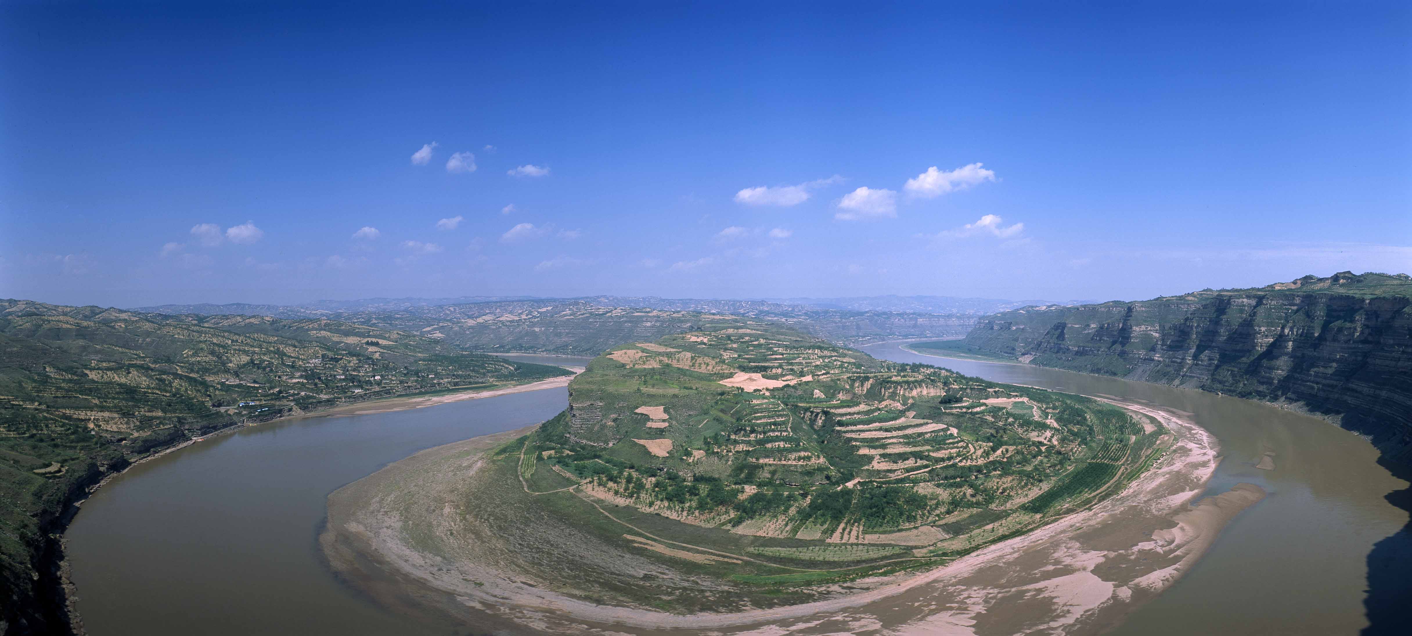 永和乾坤湾黄河蛇曲地貌位于晋陕黄河大峡谷中,北起永和县前北头,南至佛堂,西到黄河中线东到四十里山,南北长50千米,东西宽约1-10千米,总面积约105平方千米。乾坤湾NS方向展布,河床形态为U型,河道长58千米,直线距离31千米,平均曲率为1.89;河床落差52.7米,河床纵比降为0.9‰,河床宽度为80-400米,河流三级阶地距河床高差为80-150米,一般约110米。