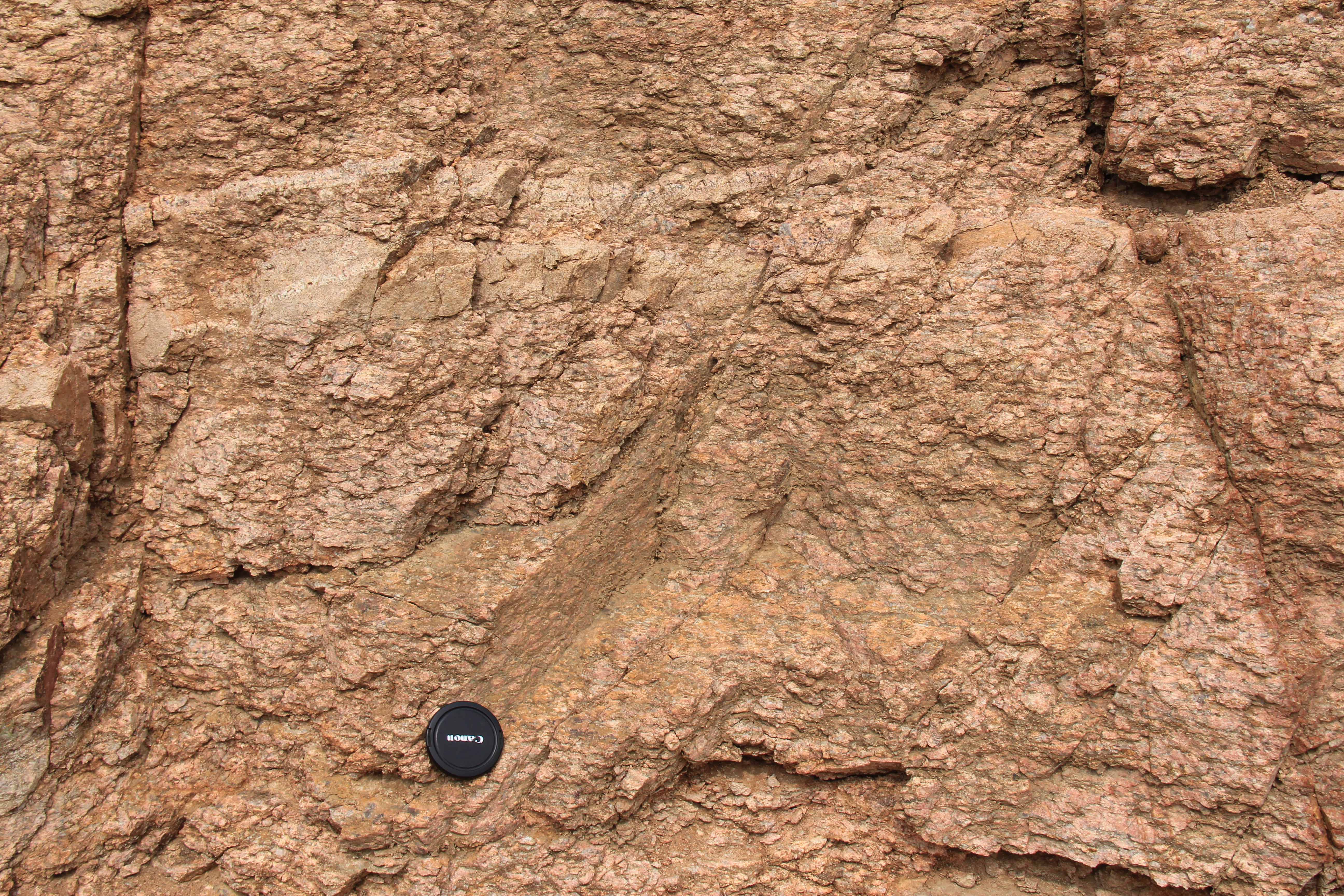 剖面岩性从岩体边部到中心大体可分为中细粒片麻状花岗岩、中粒片麻状花岗岩、中粒似斑状片麻状花岗岩、中粗粒似斑状片麻状花岗岩等几种岩石类型,即总体为片麻状花岗岩。岩体从边部向中心,矿物粒度变粗,微斜长石、石英含量增高,黑云母、普通角闪石略有减少,片麻状构造发育,中心微斜长石斑晶变形成眼球状构造。