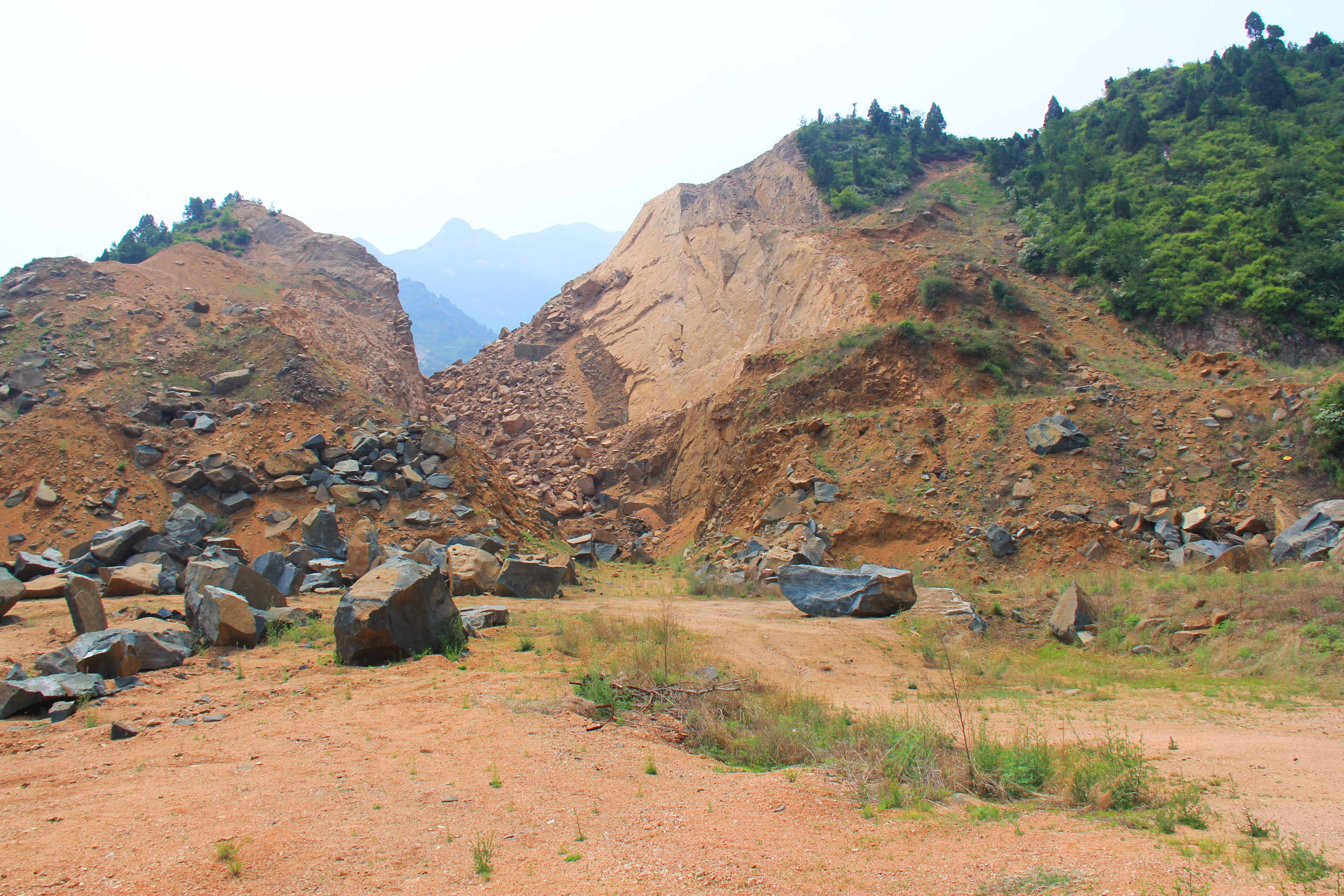 盂县的矿业遗址为盂县石家塔辉绿岩矿,檀山沟-石家塔一带的辉绿岩区内出露长约8千米,向南东延伸长几十公里,宽约100米。辉绿岩走向北西120°,长50米,宽20米,其围岩为吕梁期片麻状花岗岩。辉绿岩脉体厚度15米,产状为24∠55°,围岩为吕梁晚期变质花岗岩。部分地段发育稀疏节理,节理产状0∠84°,305∠90°,地表呈球状风化。岩石经研磨光洁色泽美观,致密、坚硬、粒度均一,岩石耐风化,耐酸碱,是优良的建筑饰面材料,现在已经开采完毕,只剩多条废弃的采矿带。