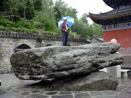 原来这块巨石是23亿年前海滨沉积的含烁砂岩,经地壳运动变质变形,斜置在金阁岭上,近代的风化作用将它剥蚀出来,顺坡滑落下来。巧的是此巨型板状岩石的重心,正好坐落在其下垫岩石支点上,岩石重力中心与支点在同一垂线上,所以只要轻轻一个推力,支点上的巨石就会摇摆。这种现象称为“风动石”,意思是微风吹拂下,支点上巨石就会晃动。
