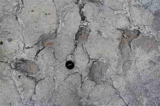 其实巨石突起,是五亿年前海底的生物礁,那时的单细胞藻 类植物在此落地生长,群体聚集成礁石而高出海底,与周围薄层状沉积明显不同。只要仔细观察便可见此巨石上面有一个个圆形痕迹,那是柱状叠层石的横断面花纹。也只有厚层块状石灰岩,才能在表面造成碗状溶蚀凹坑。