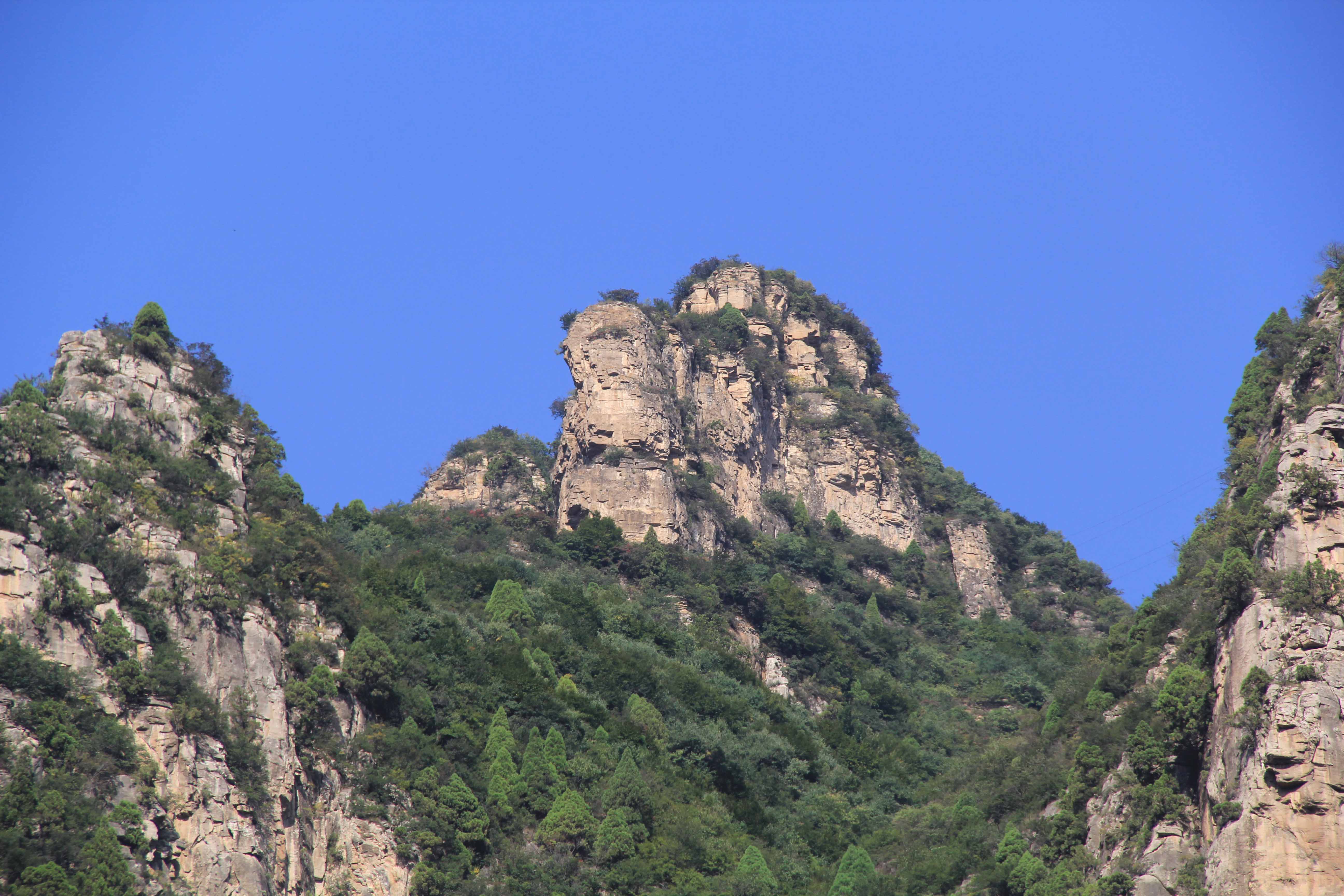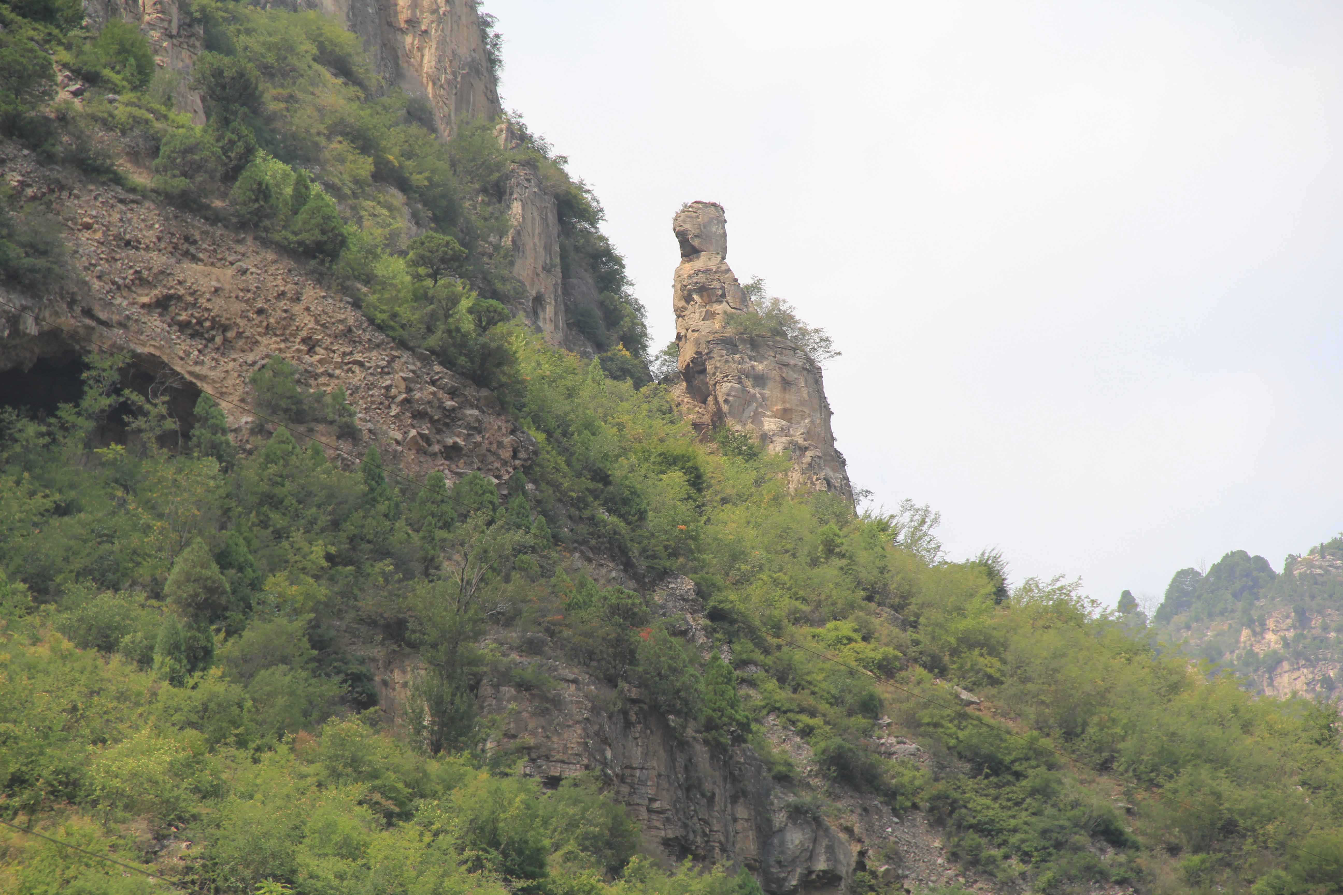 “唐僧打坐”象形石岩性为寒武系张夏组鲕粒灰岩,高约18米,是风化、重力崩塌作用形成的石柱,酷似人形而得名。